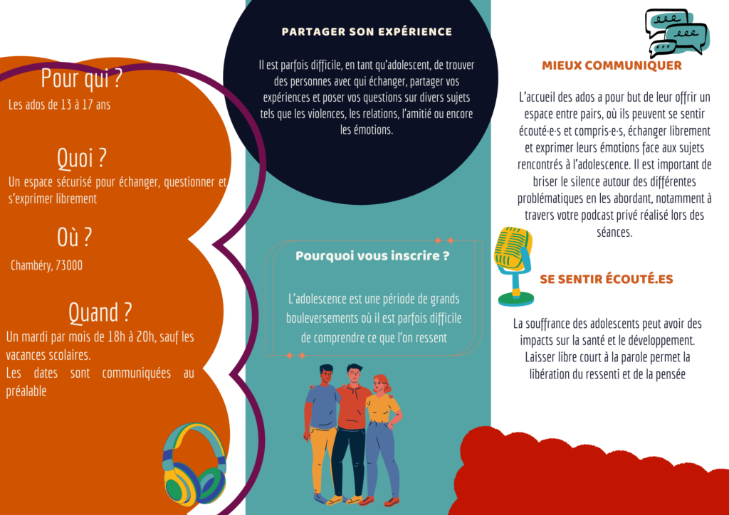 Destiné aux jeunes de 13 à 17 ans, ce groupe s’articule autour de la création d’un podcast qui leur est destiné. Ce support leur permet d’échanger librement et d’exprimer leurs émotions face aux situations rencontrées durant l’adolescence, afin de briser le silence autour de différentes problématiques.